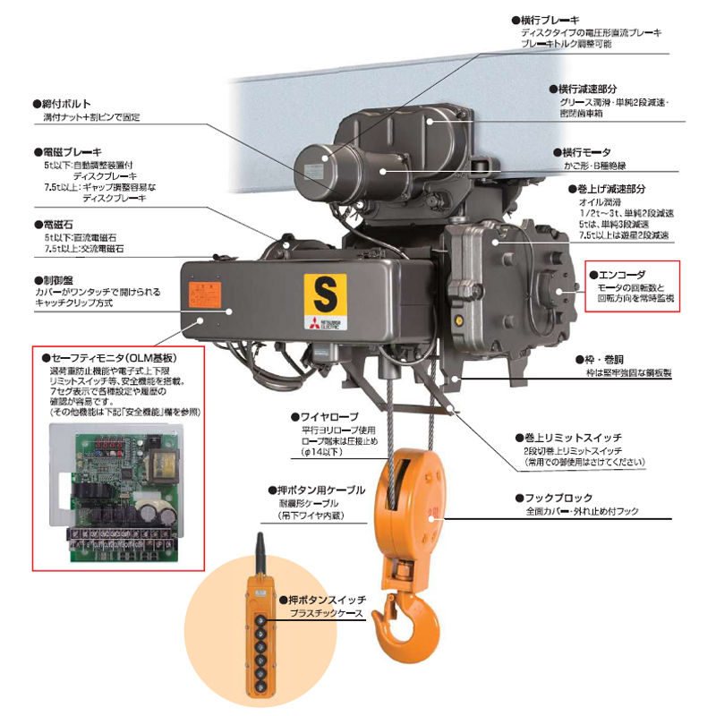 下限:逆巻、ワイヤロープ脱落など巻下げ過ぎによるトラブル防止に役立ちます。